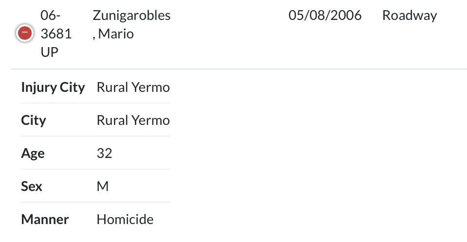 I tried checking the San Bernardino Coroner's Death Register Search but the webpage doesn't load for me. Could someone give it a try to check if there's an entry for Yermo John Doe, please?