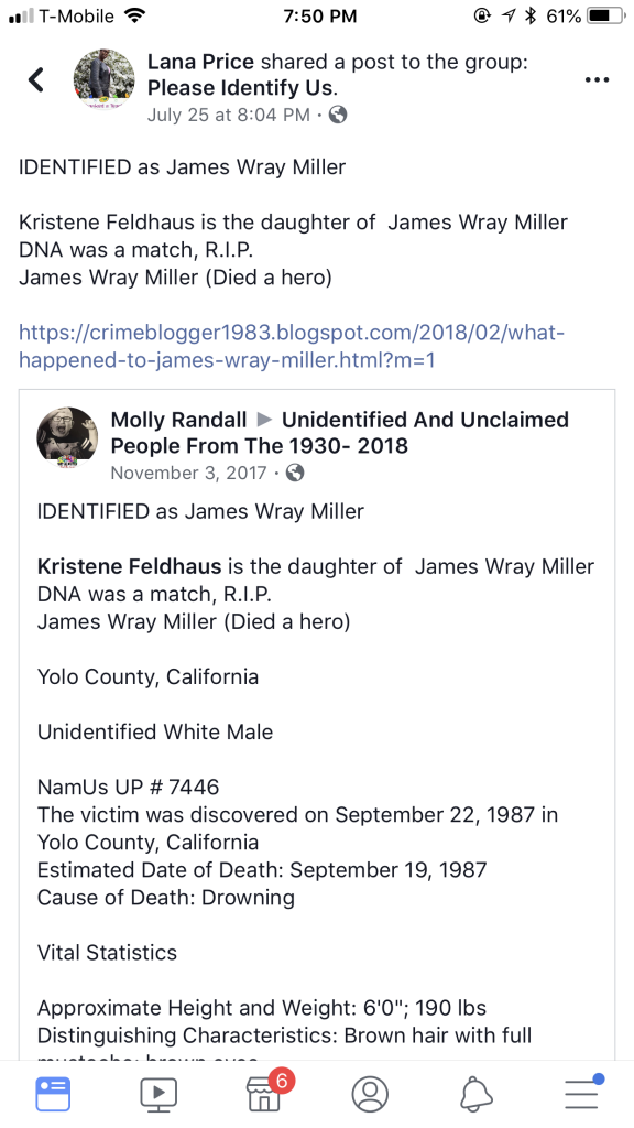 taramarie said: He was identified as James Wray Miller. Click to expand... 2 sets of remains identified by Yolo County coroners through DNA testing