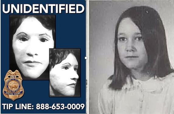 The images are from a facial reconstruction of a skull without a lower jaw. The chin is generic and the hair could be any style. If you have information that could help investigators identify this young homicide victim, please contact us.