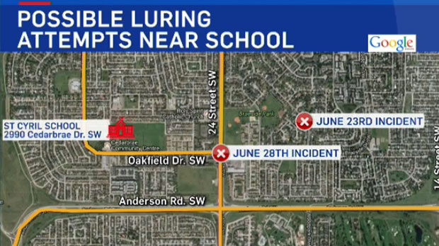 On June 28, another letter was sent to St. Cyril parents after a third luring attempt in the area. The school said a 14-year-old student walking home alone at around noon on Oakfield Drive near 24 Street S.W. was approached by a black, four-door, older model sedan with rust around the wheel wells.
