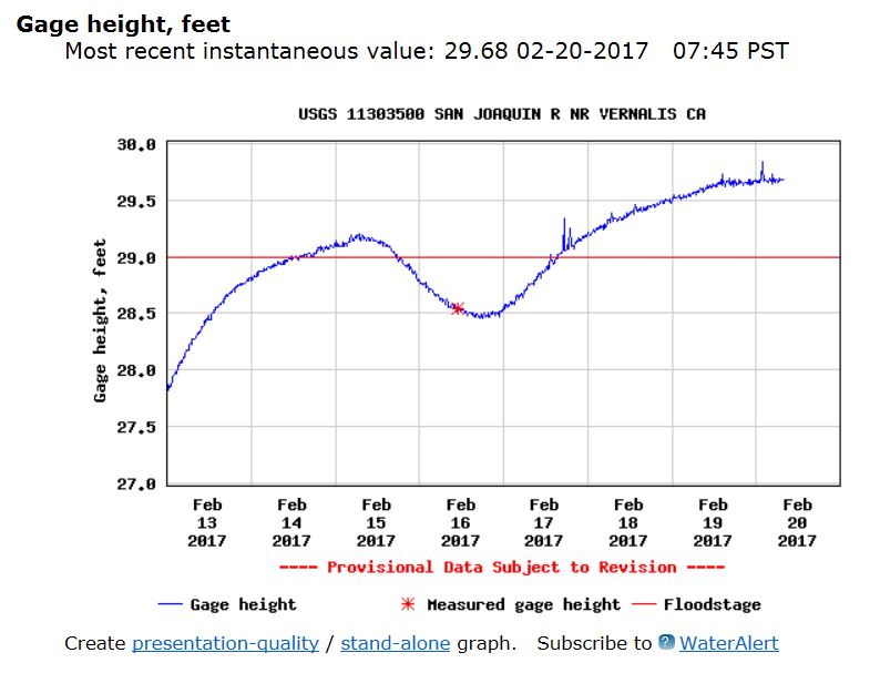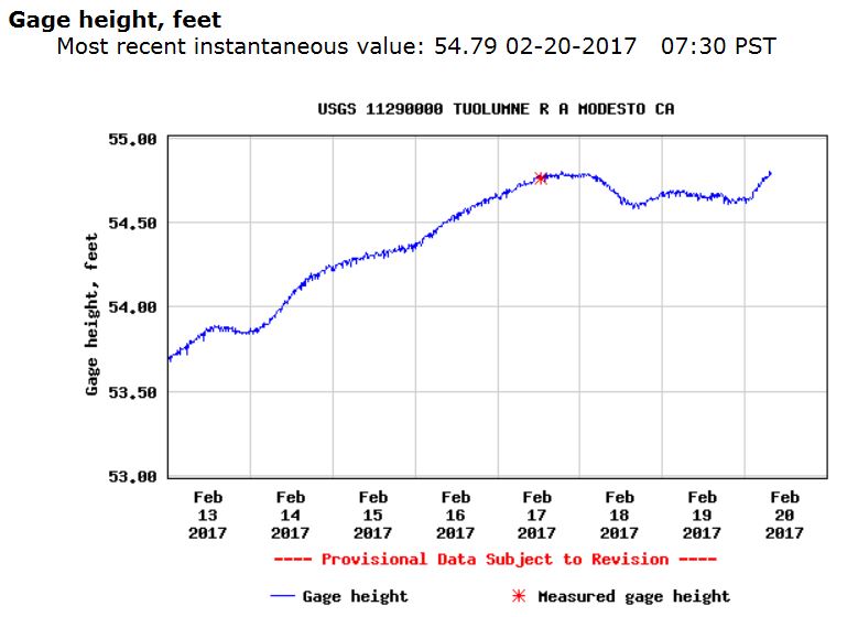For comparison, the river was at 54.96 feet at 2:30 p.m. Monday, and flow was 10,800 cfs. Flood stage of the Tuolumne is 55 feet.