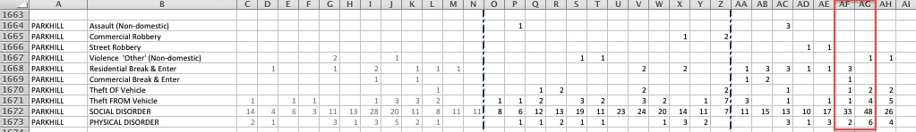 CPS website has crime stats like a 2014 Excel file and then 2014 monthly stats in PDF formats. Now, the excel spreadsheet does not have the category 'homicide' on it, but has Violence 'Other' (non-domestic), does homicide fall under this category or is homicide not on this list??? On the screenshot AF=June and AG=July. I find it strange homicide is not on this, which could be the case so nothing weird about it…The screenshot is for Parkhill neighborhood.