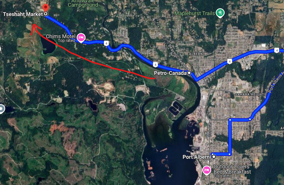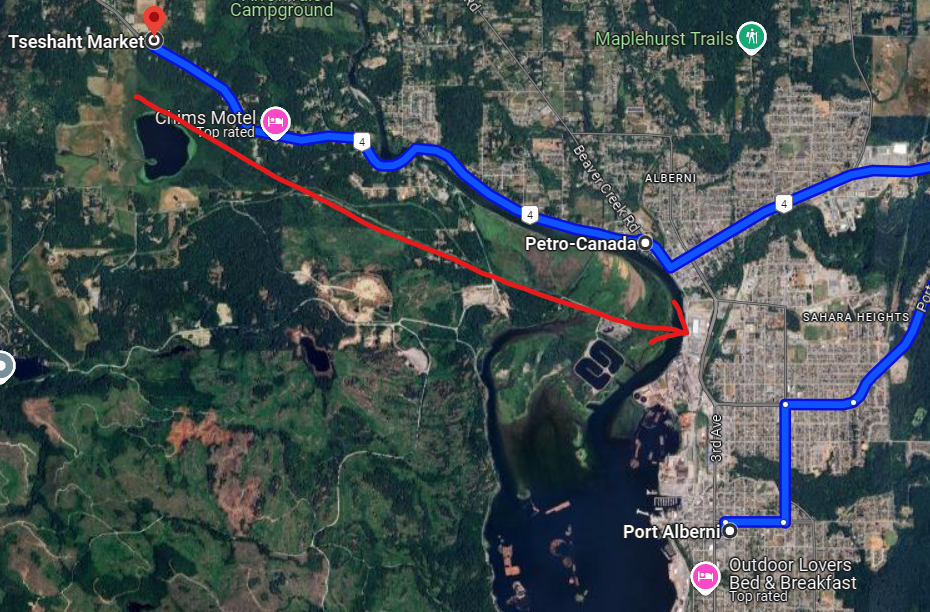 We can guess that after the camera sighting at Tseshaht Market the cab continued west to Amber's residence at Great Central Lake. Great Central Lake is within 48 minutes of Tseshaht Market. I imagine Amber's residence is closer than 48 minutes because of this detail;