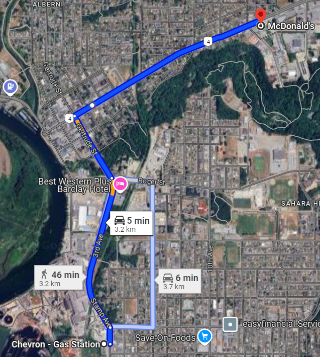 So, between the 5 minute drive from United Cabs to the Petro can, and the 7 minute drive from Petro Can to Tseshaht Market, 9 minutes are unaccounted for. Could be that it took some time between the dispatch and the pickup, or perhaps there was a stop between the pickup and the camera sighting at Tseshaht Market.