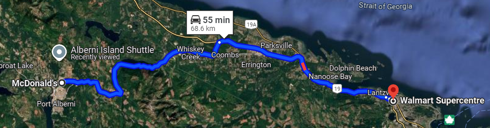 2 hours and 20 minutes later Hall is observed on camera making a purchase at the Walmart at 6801 Island Hwy N, Nanaimo, BC V9T 6N8. These two destinations are 55 minutes apart, according to Google.