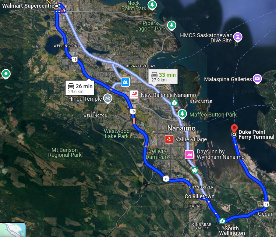 Finally, Hall is seen on camera at Duke Point Ferry Terminal, 400 Duke Point Hwy, Nanaimo, BC V9X 1H6, 1 hour and 4 minutes after been seen at the Walmart. The ferry terminal is 26 to 33 minutes from the Walmart.