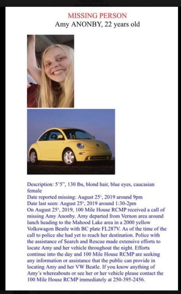 Amy Anonby was last seen on Sunday near Vernon, around lunch time, according to RCMP. She was headed for the Mahood Lake area, which is about a 2.5-hour drive north of Vernon, but has yet to arrive.
