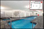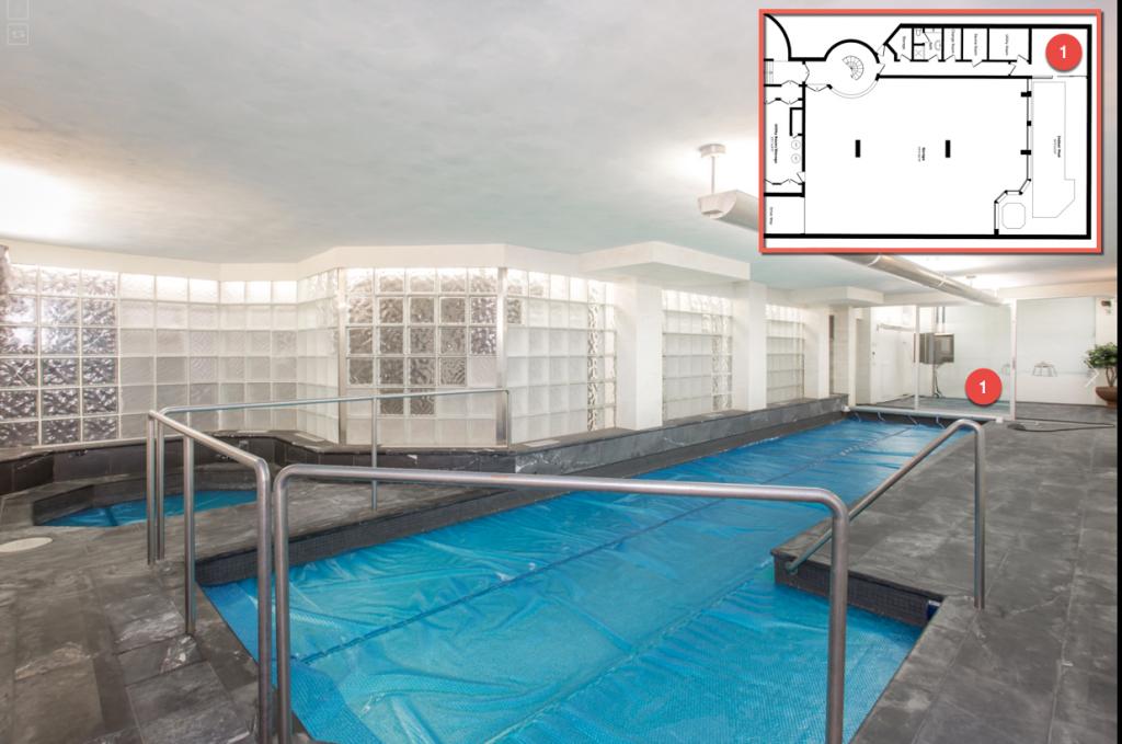 After looking at all the pictures of the house and the floor plan I believe the indoor pool room was a dead end room. It appears to have only the one entrance which is the wall that almost looks like a mirrored wall. So as you come around that corner to the last room of the entire house what would you see across the pool room at the hand rail looking back at you?