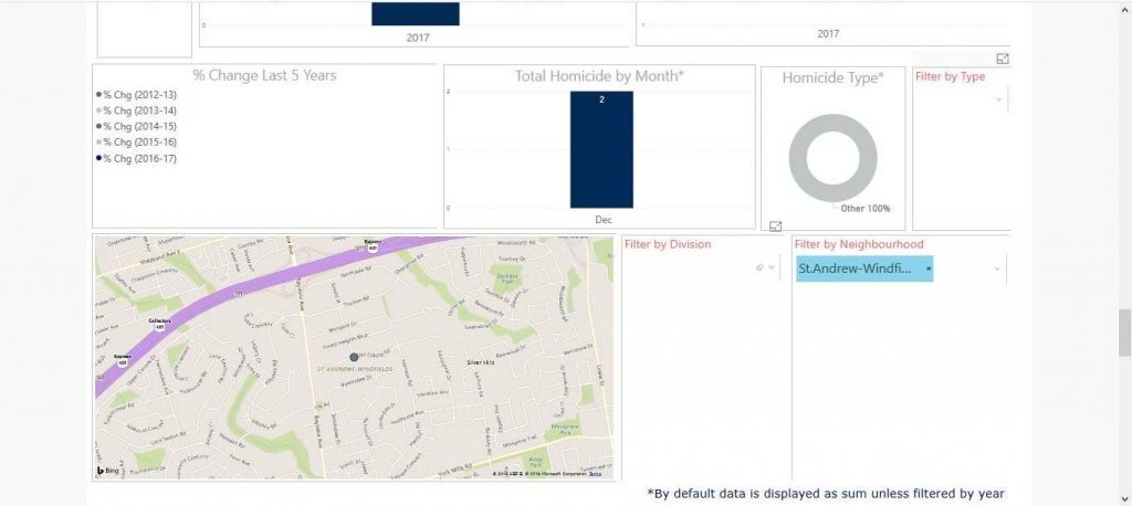 Please have a look around this link below. I can see that in Toronto there were 8 homicides in December 2017. Two just *happened* to be in the area of Old Colony Road. You can filter by neighbourhood: St.Andrew-Windfield; also look at the homicide dots on the map of Toronto for the month filtered to December 2017 and see the dot on Old Colony Road - although one dot is there, the thing lists 2 homicides there at that dot, since when you press on the dot, the graph changes to '2'; look at the homicide type - 100% of those same 2 at that location were by: 'other' (not shooting or stabbing); I have screenshotted what I'm looking at below.