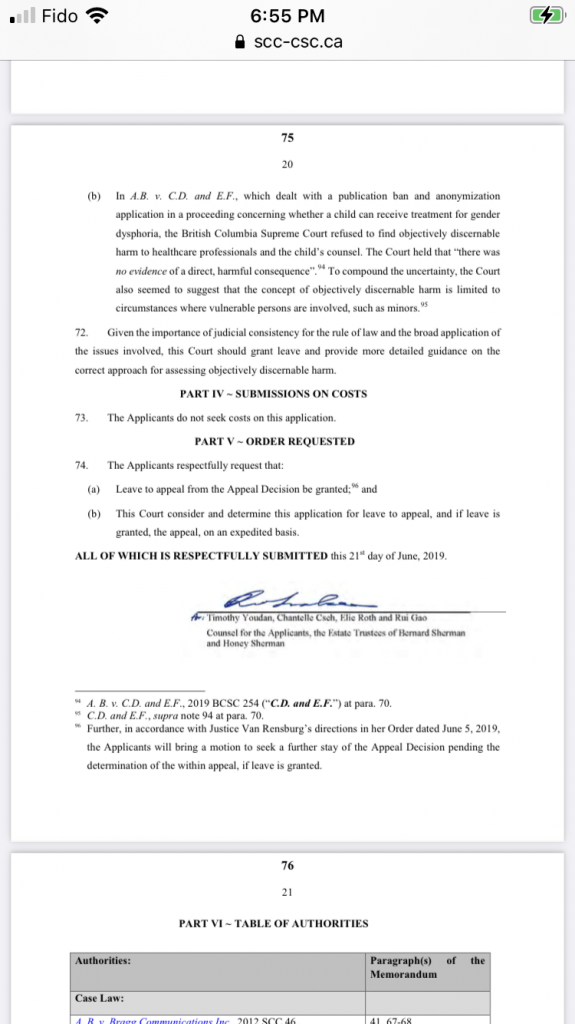 On the topic of Estates and Wills, I noticed the Supreme Court of Canada appeal by KD only pertains to The Estate of Bernard Sherman - not The Estate of Honey Sherman nor the Estates of Barry and Honey Sherman. Only The Estate of Barry Sherman.
