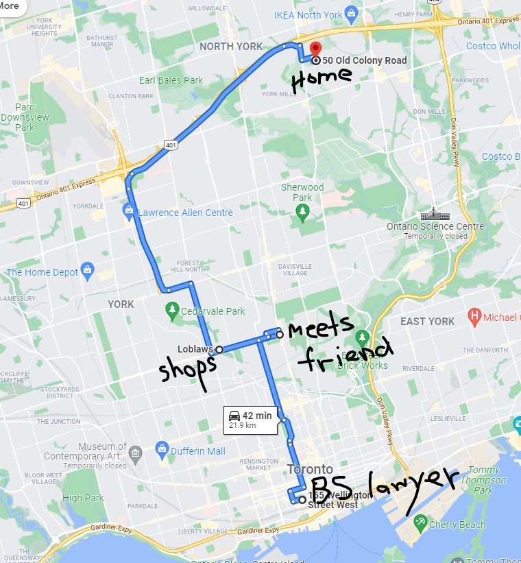 I did a little map of the day that HS supposedly updated her will. BS lawyer was noted as Davies Ward Phillips and Vineberg LLP which is located at 155 Wellington St West way down near the lake. Next is her meetup with the "friend" at St. Clair and Yonge. Next is the Loblaws to get croissants, presumably the one on St. Clair Ave. Finally, the trip back to 50 Old Colony.