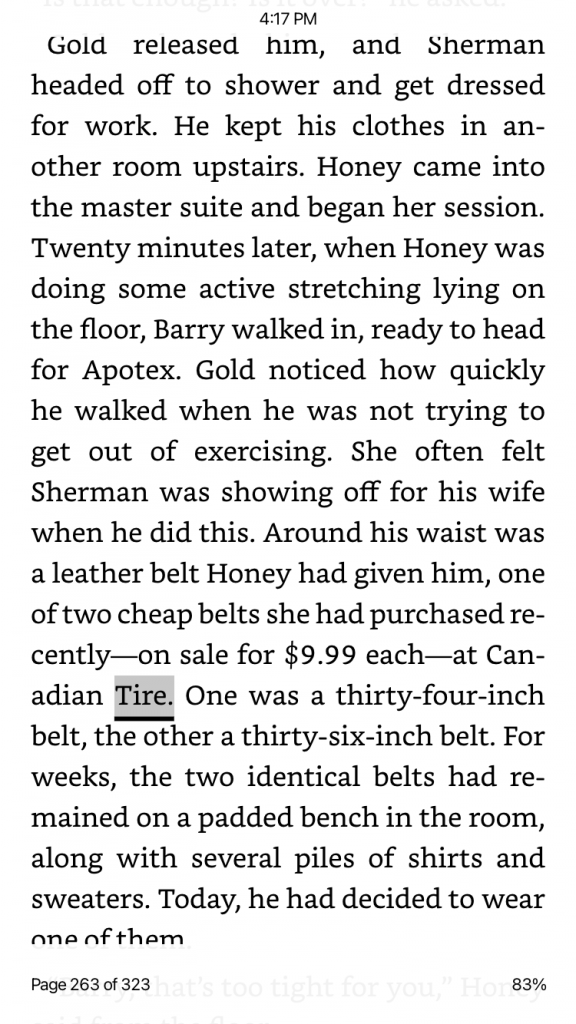 Barry heads to the office mid-morning. He is wearing one of two belts Honey recently purchased at Canadian Tire for $9.99 each, and “proudly” shows off how good it looks to Honey and Denise Gold.