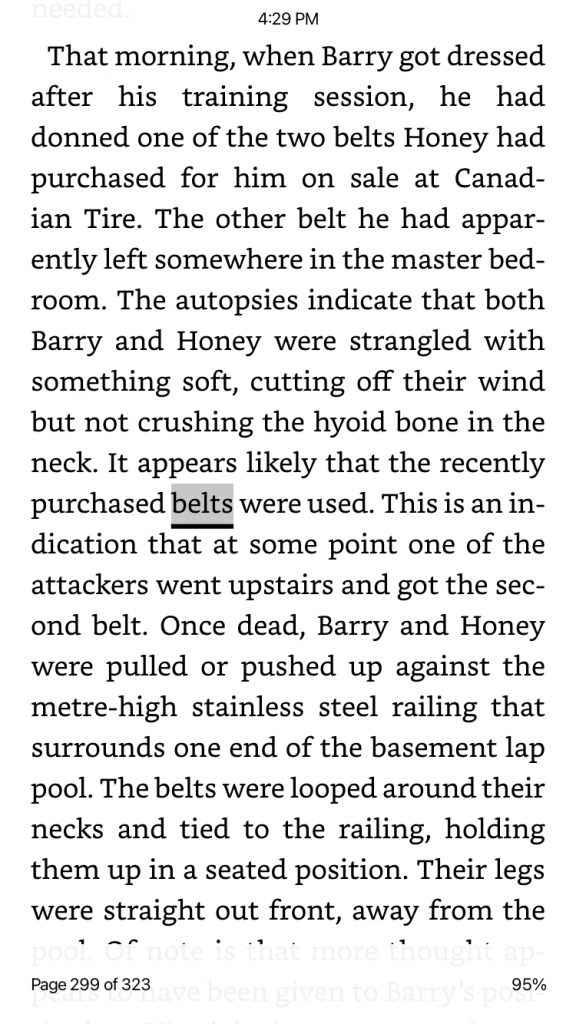 Q: You also write that you don’t think the killer or killers were professionals. One reason is the use of belts—one was taken from an upstairs bedroom. Organized criminals don’t look for their murder weapons at the scene.​