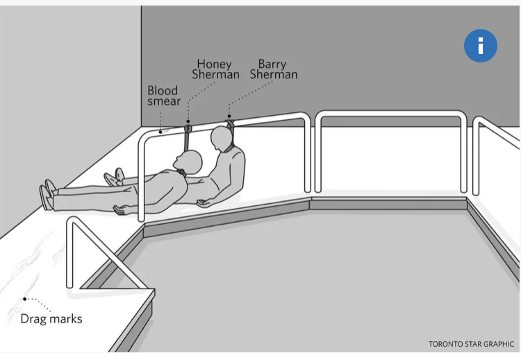 “Their arms were behind them and their bodies were being held up by black belts wrapped around their necks and tied to a railing approximately” three feet (just under a metre) above the deck of the pool. The documents show the Shermans were positioned with their backs to the pool, feet almost touching the wall on one side of the pool. Barry’s wrists were “restrained” at some point, but no ties or other restraints were found at the crime scene…