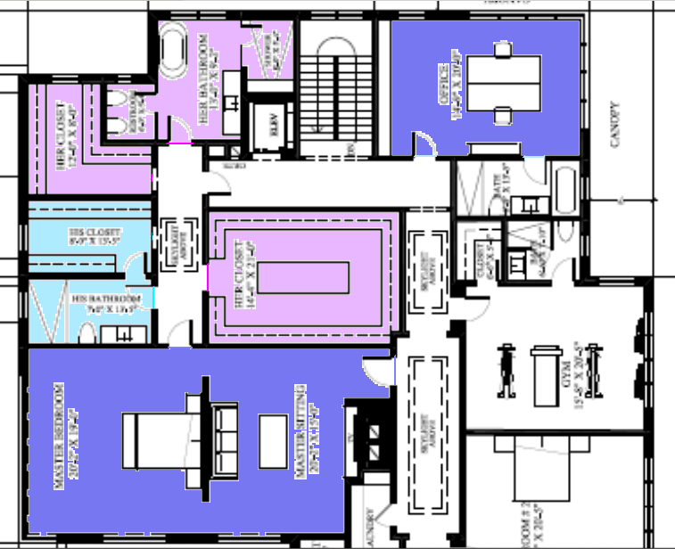 Notice the small closet and bathroom for him (light blue), as opposed to the 2 closets and bathroom for her (pink).