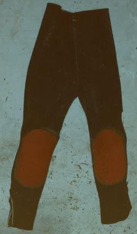 - Red, white, and black "Water Wear of Victoria" neoprene wet-suit pants with red patches on the knees.