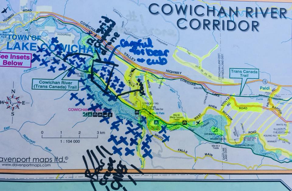 There are 3 Red circles with X’s, starting from right to left. The first area is Stone Pacific where Ben was seen on Video at 10:23am on May 16, dropping off a key from his job at the Wheel Wash in Youbou, earlier Wednesday morning.