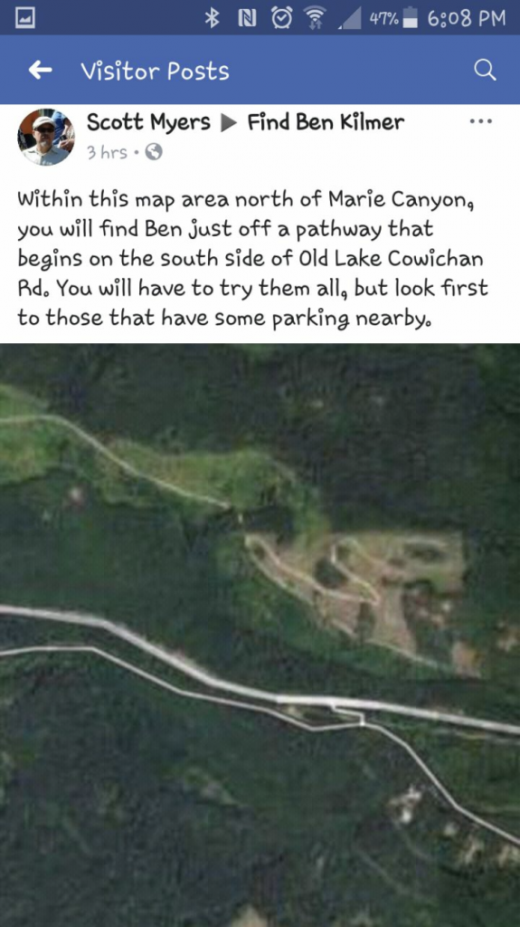 I am new to this site but I live 5 mins away from where his vehicle was found. On my way home the day of his disappearance I passed an RCMP roadblock on the site where his van was. They waved me through but I did note that this work van was parked on the right hand side of the road . I don't know if this is north,south etc. but it was parked on old lake cowichan road heading towards Lake Cowichan. The Cowichan river is where the search has been focused, not so much in Lake Cowichan. They are searching the lake and Youbou which is the other side of the lake, I think because of all the logging roads in that area. The river is much closer than the lake is too and has lots of trails, cliffs etc . Lake Cowichan is also a town, about a 20 min. drive from here. lots of beach areas as well as treed areas. Sorry you were creeped out! Its a very popular lake with many houses on it, depends on the area. There was mention on a thread from someone about wild animals-I cant find it, but maybe they will read this. The area Ben's vehicle was found has lots of open fields and not forested, treed areas yes. The black bears here are timid-may charge if they have cubs, but the only attack in the past 10 years was in Port Renfrew-other side of the island-by an old bear that wanted his fish. Cougars will stalk and kill but usually at the end of summer when they are starved and usually at the northern part of the island. I am as stumped about this as anyone! I only know that the cops aren't making any statements at all andI think this is why people are making their own speculations and nasty false rumours are spreading.