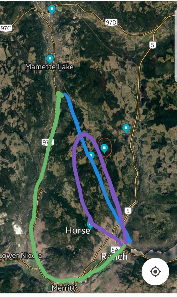 But if Ben wanted a shorter ride covering the same general area, he could ask someone to pick him and his horse up at his home on the ranch. They could drive down the "U" to Merritt, and up the other side past Lower Nicola, and be dropped up. (GREEN on map) He would then have a one way ride back to the ranch. (BLUE on my map)