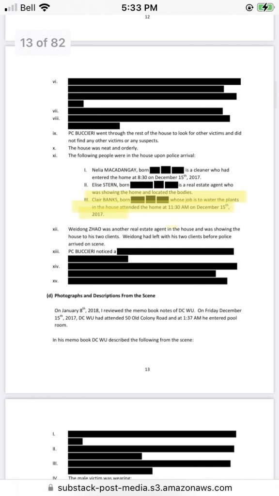 -11:56 Toronto Fire are in the pool area and advise the police that the Shermans are ‘vital signs absent’ (pg 12, part 8 (b) iii) (from newer ITOs KD has written about, we know the EMTs went into the pool room and found signs that the Shermans had been deceased for some time, and didn’t get too close to them).
