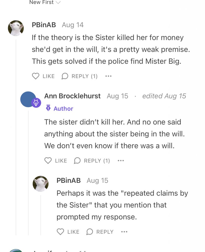 For those of you who have read Ann Brocklehurst’s latest posts on this case, you may have gleaned that she doesn’t seem to consider JS as a person of interest but rather has other ideas about the culprit(s), whom she has not yet clearly identified outright AFAIK. In her last post, (found here: What if we've been thinking about the Sherman murders all wrong? Part 1), she focuses on various litigations in which Honey and MS were parties. The insinuation from this post (MOO) was that MS may be a potential option.