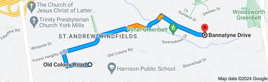 Is it such a long walk if you cut through at the end of old colony to get to Bannantyne via Swansdown Dr instead of walking only onthe streets? It seems based on the diagram that this would be a much more direct route.