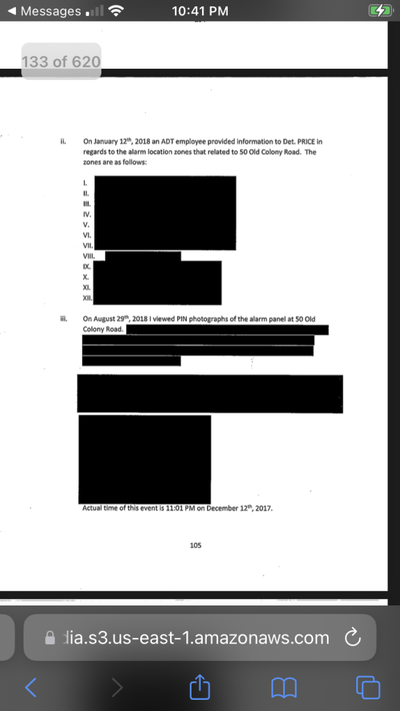 -[Date and time redacted] I think that is possibly December 13th @ around 8:00-8:20 pm when Honey arrived home and entered, imo. There’s no activity after that, and the redacted area is the same size as the other events which seem routine, so I’m guessing it was another ordinary PIN code entry to disable the alarm.