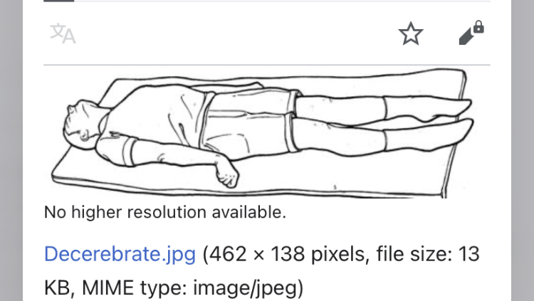 ‘Abnormal posturing is an involuntary flexionor extension of the arms and legs, indicating severe brain injury. It occurs when one set of muscles becomes incapacitated while the opposing set is not, and an external stimulussuch as pain causes the working set of muscles to contract.[1] The posturing may also occur without a stimulus.[2][failed verification]Since posturing is an important indicator of the amount of damage that has occurred to the brain, it is used by medical professionals to measure the severity of a coma with the Glasgow Coma Scale (for adults) and the Pediatric Glasgow Coma Scale (for infants).’