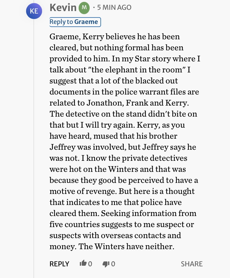 ““I’ve seen about half. I’m arguing in court on behalf of the Toronto Star and the public for the “blackout text” to be removed from the rest, hoping it will shed more light on numerous missteps in the four-year-old case. I have also asked the court to unseal information related to what I termed “the elephant in the room” — detailed statements by and about three people who by their own admission were probed in the case.”
