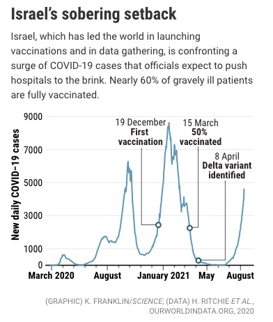 "Israel, which has led the world in launching vaccinations and in data gathering, is confronting a surge of COVID-19 cases that officials expect to push hospitals to the brink. Nearly 60% of gravely ill patients are fully vaccinated.