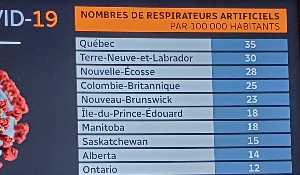 Ontario is the province with the lowest number of ventilators : 12 for every 100,000 people. Sobering thought.