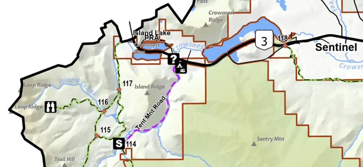 I also circled red on the map where it sounds like they maybe were possibly camping - South of Hwy 3, looks possibly on the road that leads to Tent Mtn? Unless they camped outside of the norm camp areas (marked by the camping map icon).
