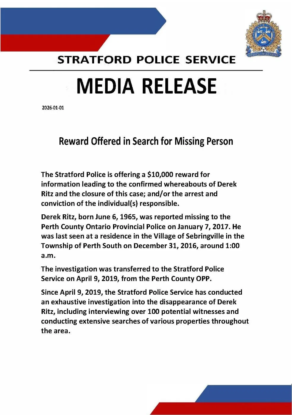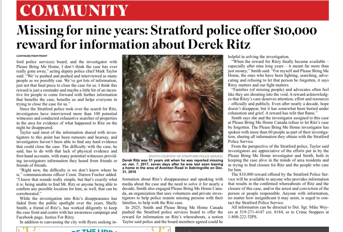 ''It’s believed to be the first time Stratford police have offered a reward to solve a cold case. The reward will be given to any individual who provides information that results in the confirmed whereabouts of Ritz and the closure of this case, and/or the arrest and conviction of those involved.