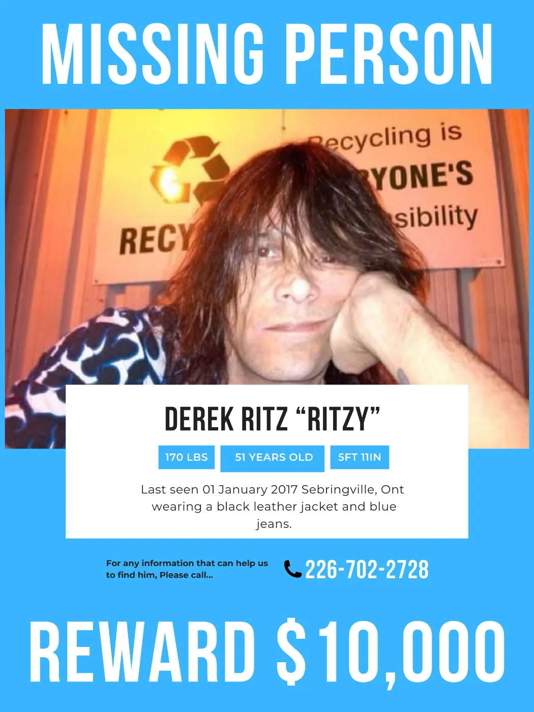 Ritz went missing from Sebringville, Ontario on January 1, 2017. He was last seen getting into a vehicle at his residence on Avonton Road around 3:00 a.m. and has never been seen since.