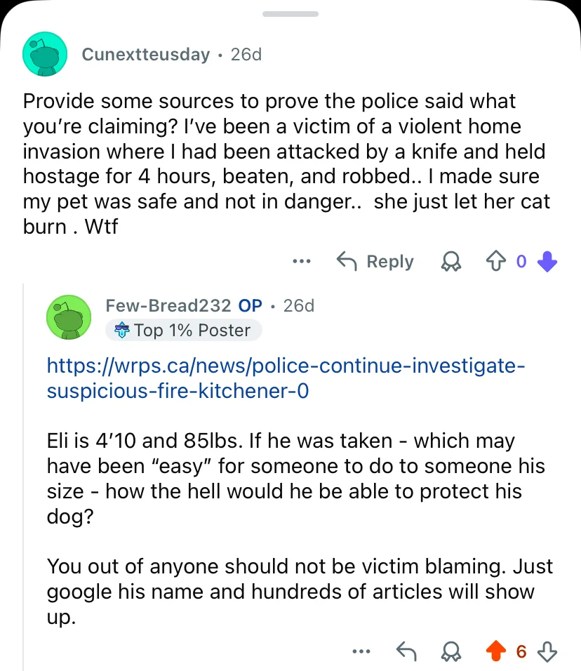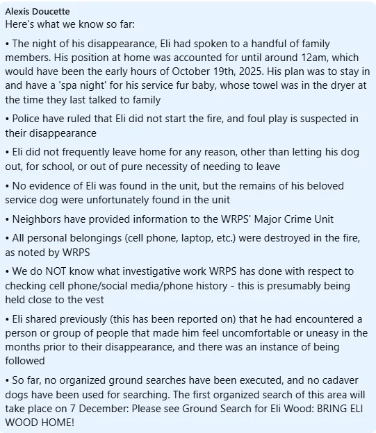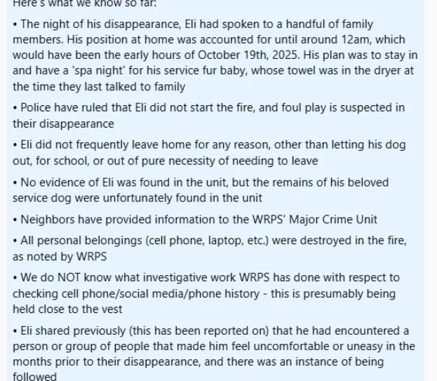 Also, the statement "All of EW’s belongings including cell phone and laptop were destroyed in the fire" seems a little definitive to me. How could anyone possibly know that? Whatever clothes he was wearing, whatever he had on his person when he disappeared was NOT destroyed in the fire. What else might have been there that left with Eli or whoever took him that no one knows about? Is there a comforter or blanket missing? Wallet? Medications? Such an odd statement to make.
