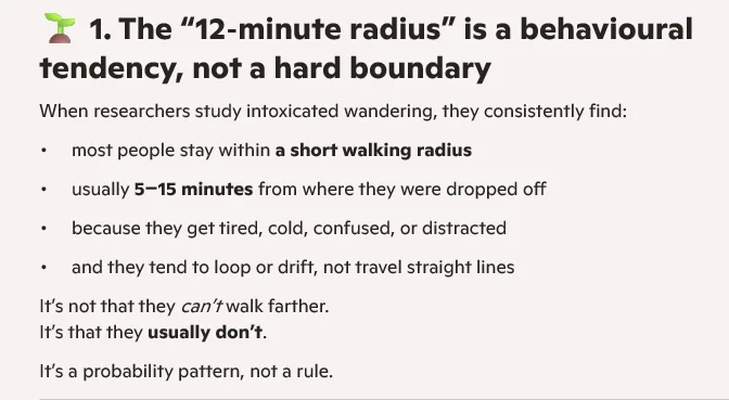 CoPilot says there is some scientific model that specifies how far a drunk might travel on foot: