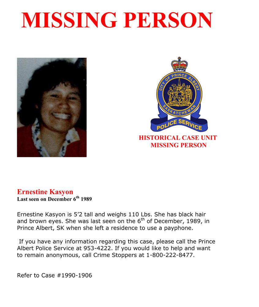 Ernestine KASYON was last seen on the 6th of December, 1989, in Prince Albert, SK when she left a residence to use a payphone.