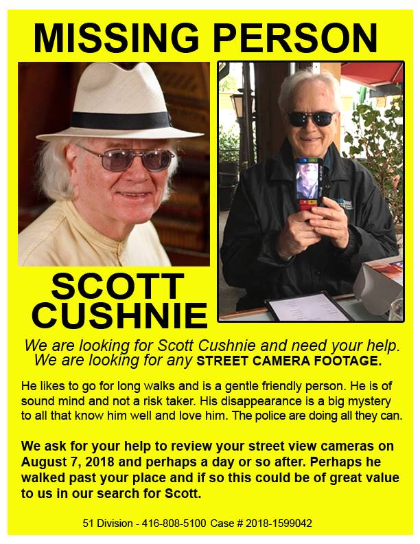 Scott Cushnie is better known to Toronto audiences as Professor Piano. The 80-year old was reported missing August 29th, but hasn’t been seen since August 7th.