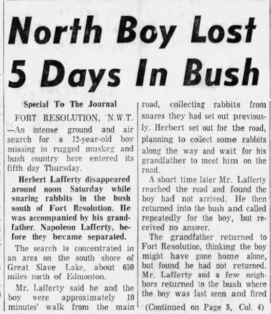 Lafferty was last seen just outside of Fort Resolution in the Northwest Territories on October 8, 1960. He went to check the rabbit snares with his grandfather and never returned. He has never been heard from again. Some of his friends had reported that Lafferty had made plans to rejoin his mother in British Columbia. Few details are available regarding his disappearance and his whereabouts remain unknown.