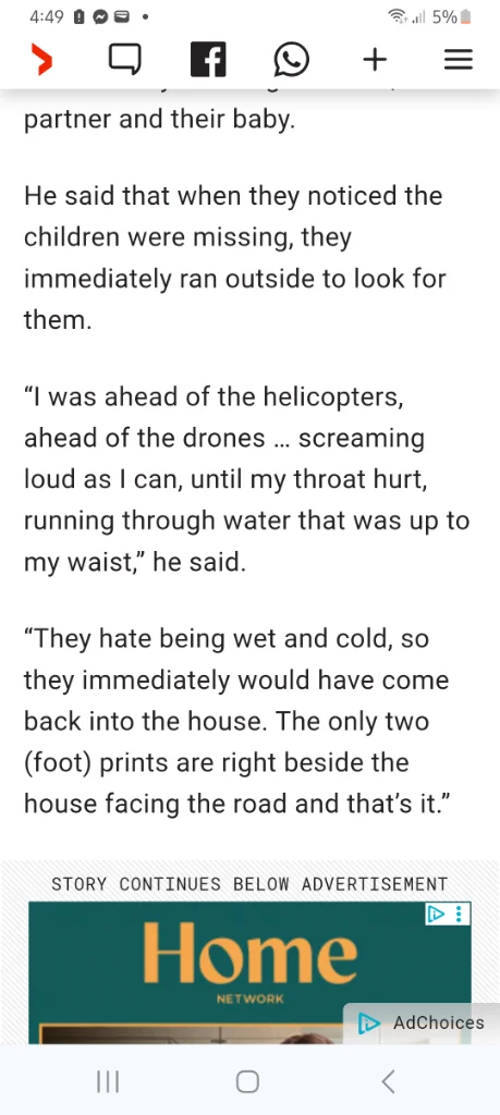 My opinion at the moment is nothing is off the table in regards what may have happened to the kids . I vary between thinking they are in the yard stuck after getting into a crawl space but dead to a stranger abduction to a family member harming them or abducting them to them wandering off by themselves and getting lost or a hansel and gretel situation