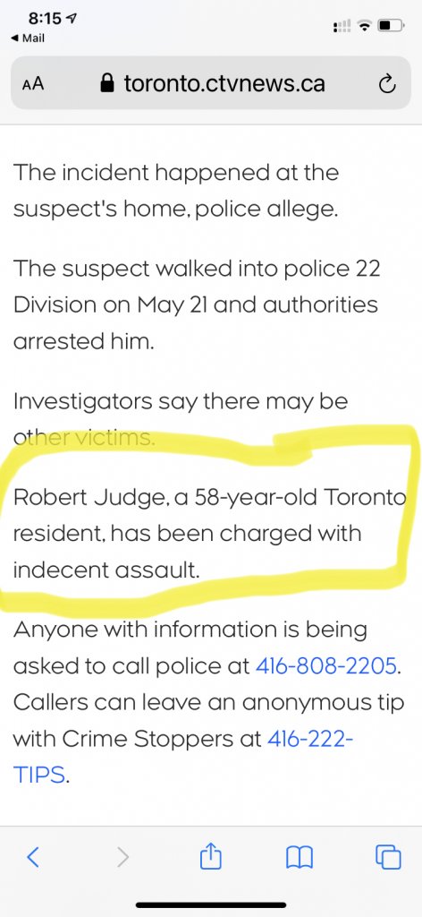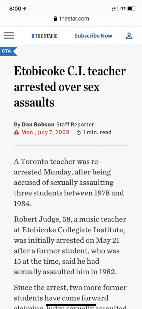 My name is Jon Riley. I went to Etobicoke Collegiate in 1981. In grade 10 a music teacher, Bob Judge, sexually assaulted me in his home. I heard stories of another music teacher named Don Strathdee doing the same thing. If you have heard of anyone else that was assaulted by either of these teachers please contact the Toronto Police which are investigating [email protected] Also I am suing Bob Judge for damages and need other victims to come forward to help my case, victim or someone with information. In confidence you can email my lawyer at [email protected] The victims can go by a John Doe name and be represented by my lawyer at no costs and submit a claim too.
