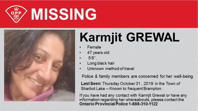 The OPP are asking for the public’s assistance in locating Karmjit Grewal, 47, who was last seen on Oct. 31.