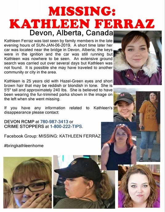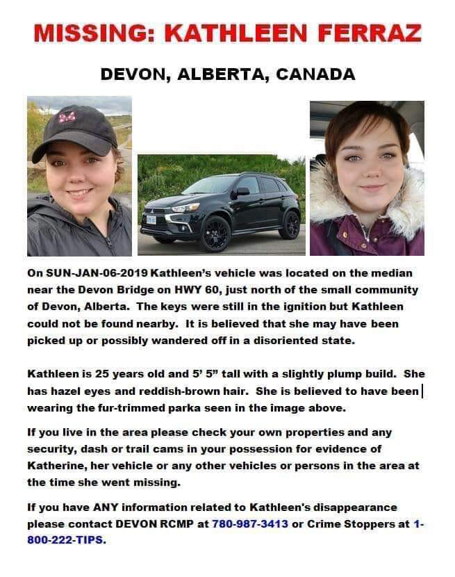 The RCMP in Devon have issued a missing persons report for 25-year-old Kathleen Rose Ferraz-Duchesneau.