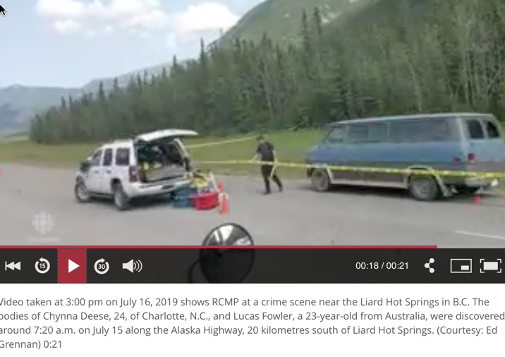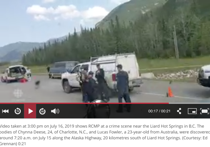 Video taken at 3:00 pm on July 16, 2019 shows RCMP at a crime scene near the Liard Hot Springs in B.C. The bodies of Chynna Deese, 24, of Charlotte, N.C., and Lucas Fowler, a 23-year-old from Australia, were discovered around 7:20 a.m. on July 15 along the Alaska Highway, 20 kilometres south of Liard Hot Springs.