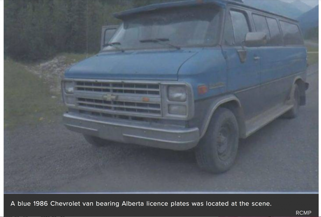 View attachment 194123 Blue 1986 Chevrolet mentioned by RCMP Spokesperson that was found at the scene of the murders. Note per Gray Hughes van in partially located on the road and partially on the road shoulder.View attachment 194123