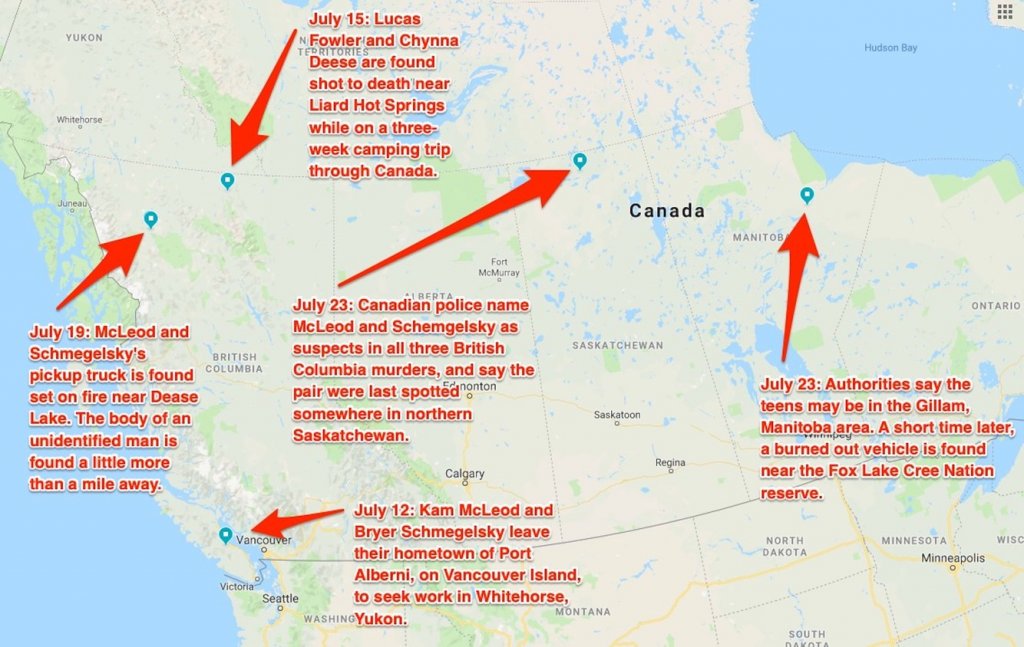 Bryer and Kam left July 12th. Bryer's grandmother said they arrived at Whitehorse a few days later, then left when it wasn't what they thought it would be and she had no idea where they planned to go next. Yet she also said the last time she had been in touch with her grandson was July 13th or 14th.