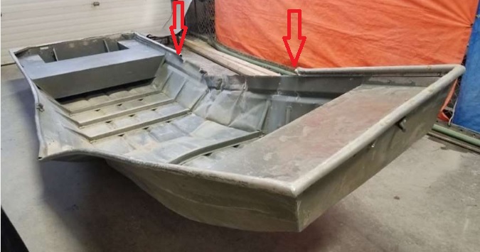 Maybe the river didn't damage the boat at all; if they were hiding under or behind it, a grizzly or polar bear could easily damage an aluminum boat by jumping on it to get to prey.