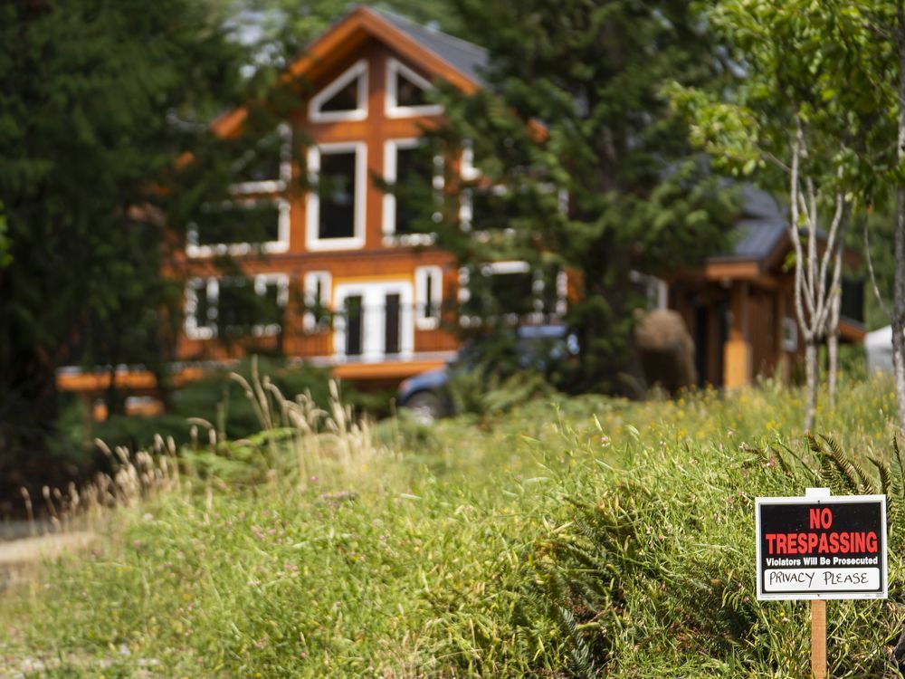"The blue sky and lush greenery surrounding the chalet-style home across the street from beautiful Sproat Lake....