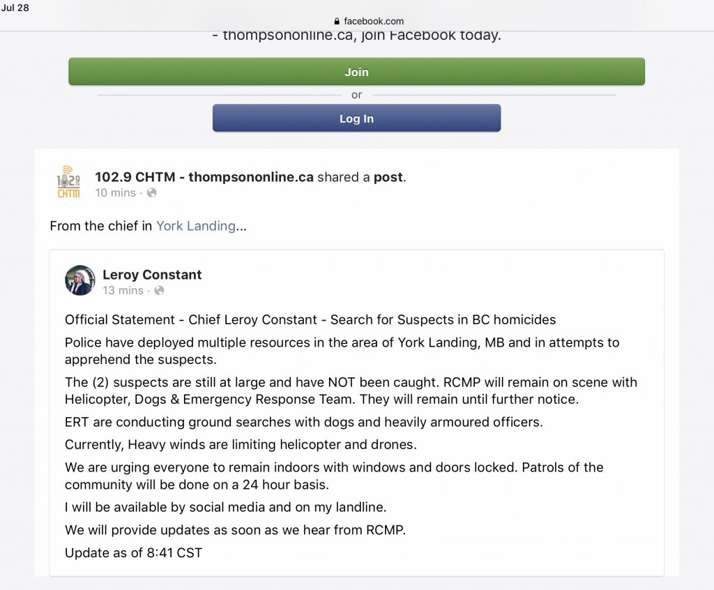 Despite reports - there is no one in custody at this time. RCMP officers remain in the community of York Landing & continue to investigate the reported sighting of the two suspects. All required resources are being used in this ongoing investigation. Updates to follow.