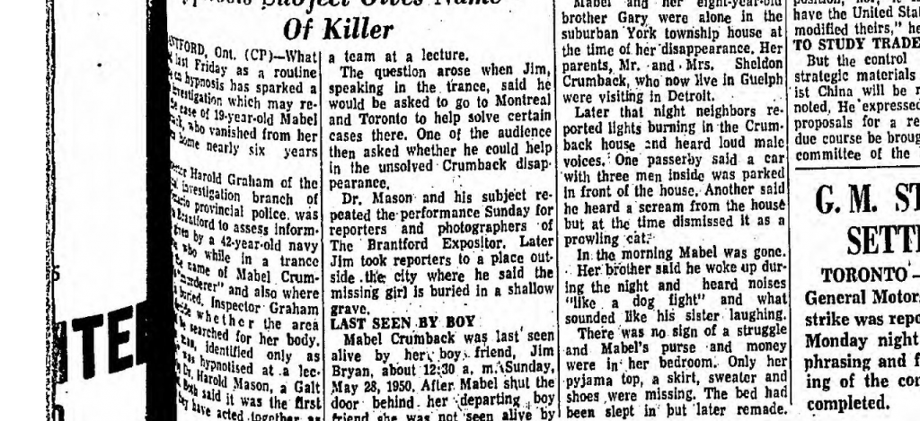 Mrs. Sheldon Crumbach now a resident of Guelph, Ont.,said she thinks the Montreal police's missing persons department can help find her daughter Mabel, who disappeared Mayh 28, 1950, at the age of 19 while her parents were attending a wedding in Detroit.